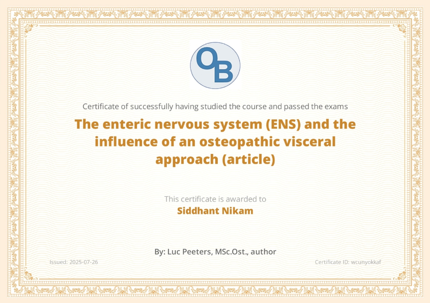 I’m thrilled to announce that I, Siddhant Nikam, have successfully completed and passed the exams for “The enteric nervous system (ENS) and the influence of an osteopathic visceral approach (article)”! This certificate, issued on July 26, 2025, represents another step in my commitment to expanding my knowledge in the field. A big thank you to Luc Peeters, MSc.Ost., for authoring this insightful course. You can find this certificate under ID wcunyokkaf.