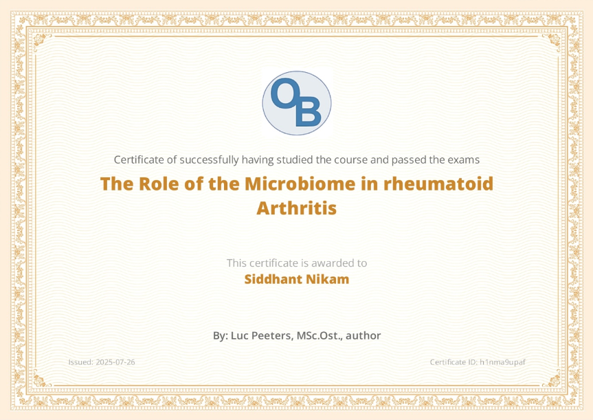 I’m excited to share that I, Siddhant Nikam, have successfully completed the course and passed the exams for “The Role of the Microbiome in rheumatoid Arthritis”! This certificate, issued on July 26, 2025, reflects my dedication to understanding the intricate connections within our health. Many thanks to Luc Peeters, MSc.Ost., for authoring this insightful course. The certificate ID is h1nma9upaf.