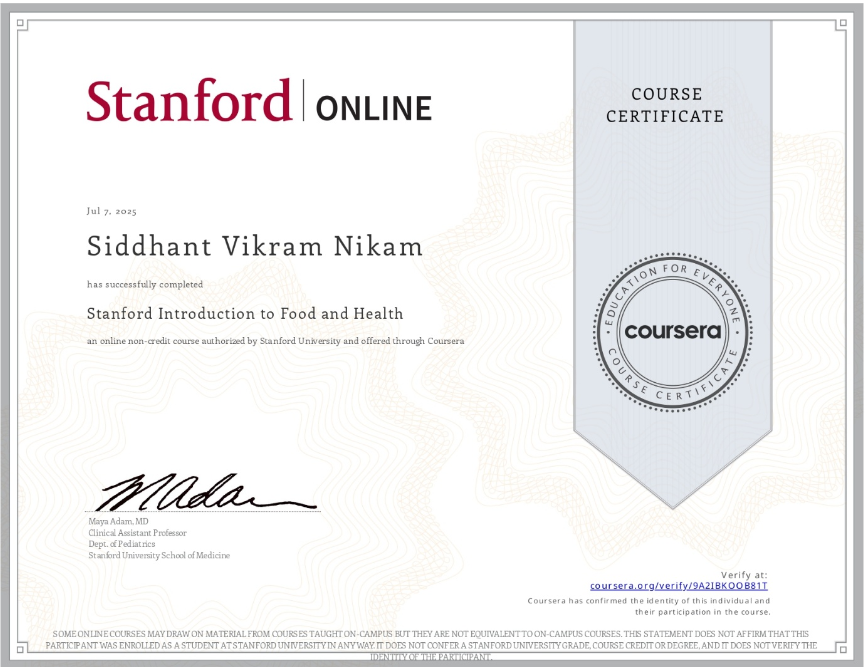I’m delighted to share that I, Siddhant Vikram Nikam, have successfully completed the “Stanford Introduction to Food and Health” course! This online non-credit course was authorized by Stanford University and offered through Coursera, with a completion date of July 7, 2025. It was an incredibly informative course, and I’m grateful for the insights provided by Maya Adam, MD, Clinical Assistant Professor, Dept. of Pediatrics, Stanford University School of Medicine. You can verify my achievement at the provided Coursera link: https://coursera.org/verify/9A21BKOQ8B1T.