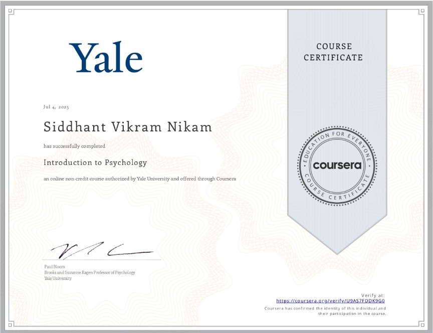 I’m thrilled to announce that I, Siddhant Vikram Nikam, have successfully completed the “Introduction to Psychology” course! This online non-credit course was authorized by Yale University and offered through Coursera, and I finished it on July 4, 2025. It’s truly inspiring to learn from experts like Paul Bloom, Brooks and Suzanne Ragen Professor of Psychology at Yale University. You can verify my achievement at the provided Coursera link: https://coursera.org/verify/U9AS7FEDDK9G0.
