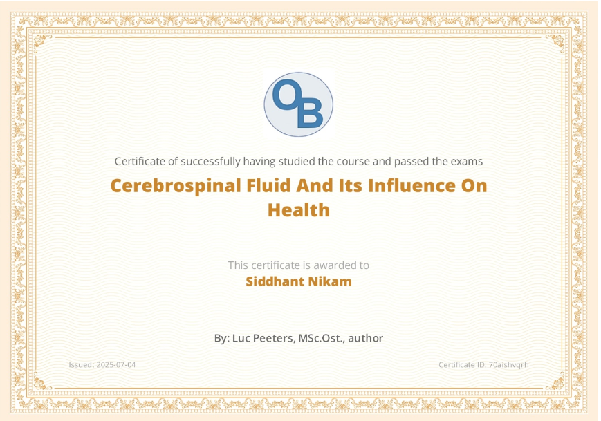 I’m pleased to share that on July 4, 2025, I, Siddhant Nikam, successfully completed the course and passed the exams for “Cerebrospinal Fluid And Its Influence On Health.” It was a truly enlightening experience, and I appreciate Luc Peeters, MSc.Ost., for authoring such a valuable course. This certificate, with ID 70aishvqrh, marks another achievement in my ongoing education.