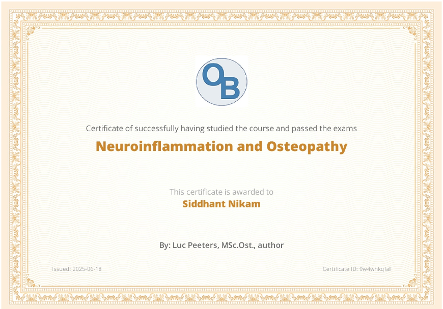 I’m delighted to announce that I, Siddhant Nikam, have successfully completed and passed the exams for “Neuroinflammation and Osteopathy”! This certificate, issued on June 18, 2025, represents another step in my commitment to expanding my knowledge in the field. A big thank you to Luc Peeters, MSc.Ost., for authoring this insightful course. You can find this certificate under ID 9w4whkqfall.