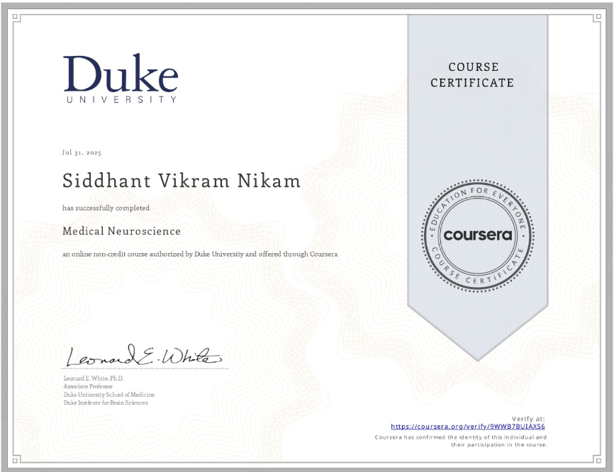 I’m excited to share that I, Siddhant Vikram Nikam, have successfully completed the “Medical Neuroscience” course! This online non-credit course was authorized by Duke University and offered through Coursera, and I finished it on July 31, 2025. It’s fantastic to add this to my learning journey, and the certificate is verified by Leonard E. White, Ph.D., Associate Professor at Duke University School of Medicine and Duke Institute for Brain Sciences.