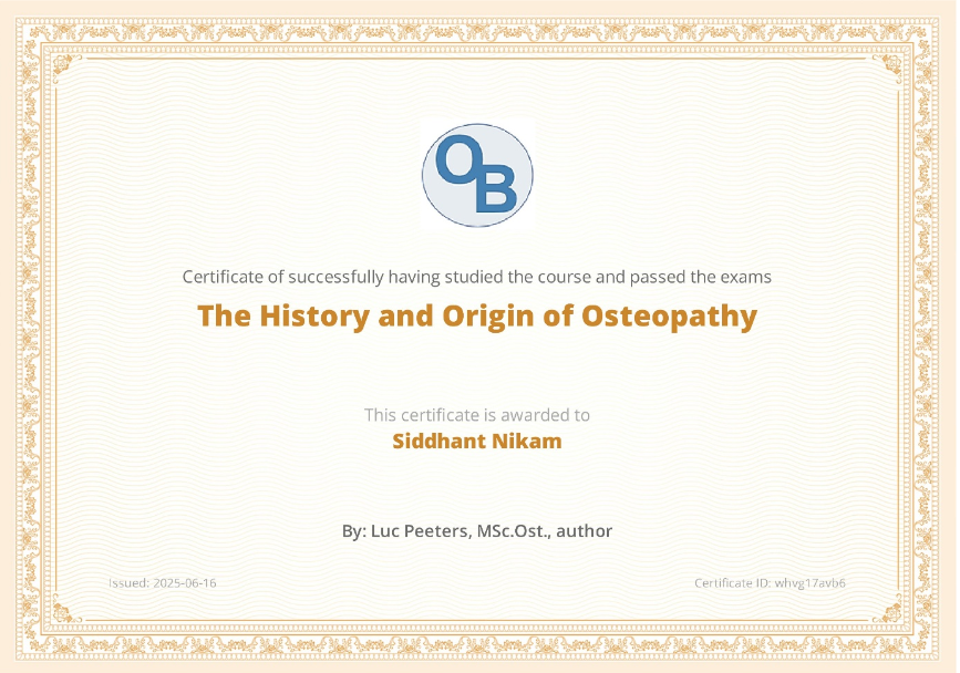 On June 16, 2025, I successfully completed and passed the exams for “The History and Origin of Osteopathy.” It was a fascinating course, and I really enjoyed delving into the material authored by Luc Peeters, MSc.Ost. This certificate (ID: whvg17avb6) is a testament to my hard work and dedication.